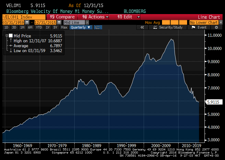 Philosophical differences aside, the bottom line is that the policy won’t work as evidenced by my favourite picture of the millenium – the decline in the velocity of circulation of money. The picture shows that the demand for money for transactions purposes has almost halved since peaking in 2007, and now stands at the same level as in 1975. Simply put, people don’t use money much any more. The various attempts at monetary stimulus since 2007 were simply treated with disdain by those smart, forward looking people who killed off Monetarism in the first place. These people didn’t buy the pea-and-thimble trick that the Fed (and the BoJ and the ECB and others) were attempting with QE, nor do they have much time for the negative interest rate sideshow. As for the manna from heaven that is about to be showered – well let’s just leave it on the ground to wash down the drains since it can’t be real, can it?