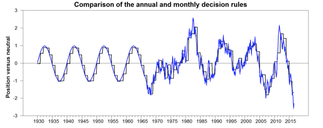 The step function is the annual rebalancing rule while the monthly rebalanced portfolio position taking is smoother.