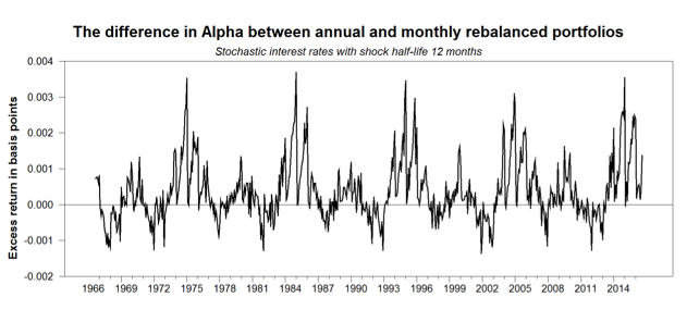 Well, numbers speak louder than words, and pictures based on numbers speak louder still. The research I report today comes from a statistical laboratory where cause and effect are tightly controlled, internally consistent and fully transparent. The objective is to prove that if underlying decision variables, such as interest rates, exhibit cyclic behaviour and persistent shock with slower moving components then annual rebalancing will outperform more frequent rebalancing rules. The proof grows on our statistical Petri dish in 4 simple steps.