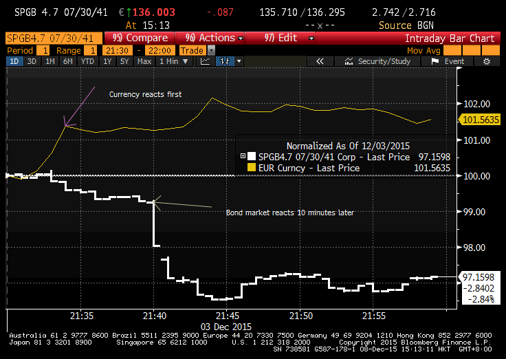 The fact that the currency market led the bond market by a full 8 minutes in response to the same information is unusual. Either these markets move in tandem or there should have been no delayed reaction. Simultaneous cross-market reaction is generally driven by movements in one price triggering stop-loss orders in other markets – for instance, a short position in Euro hedging a long position in Spanish bonds should be unwound together. This did not seem to be the case.